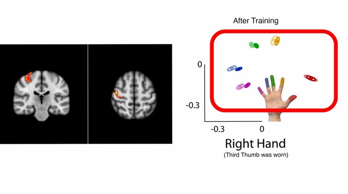 그런데, 제3의 엄지 손가락으로 훈련 한 피험자에게서는, 다섯 손가락을 움직였을 때에 활성화 부위가 약간 근접, 각 손가락의 영역이 희미하게 나타났다는 것. 또한, 제3의 엄지 손가락의 훈련을 마친 후 1주일 후에 다시 fMRI 검사를 실시한 결과, 손가락의 움직임에 따라 활성화되는 감각 운동 피질 영역은 원래대로 돌아가 있었던 것으로보아, 변화는 제3의 엄지를 붙이고 훈련을 하던 동안에 만 일시적이었던 것을 알 수있었다는 것.