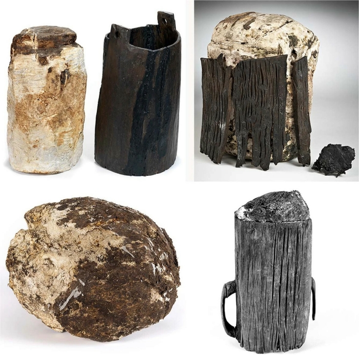 아래가 실제로 발굴된 유제품. 왼쪽 상단 원기둥 모양의 것이 가장 오래된 것으로, 기원전 360년~200년 무렵의 것으로 추정된다. 연구팀은 늪에서 발굴된 유제품을 보고 "보그 버터"라고 부르고 있다.