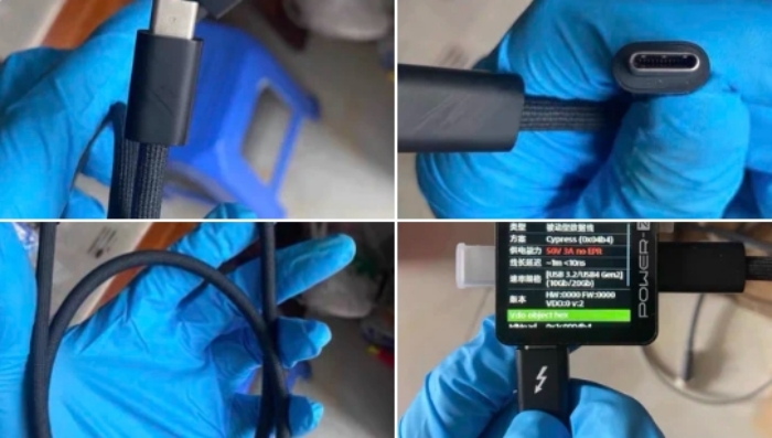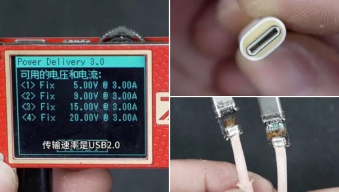 마진 부씨가 손에 쥔 USB-C 케이블의 길이는 1.6m로, 풀이라면 24핀 있는 곳에 16핀밖에 없고, USB 2.0 대응으로 출력은 20V·3A라고 한다.