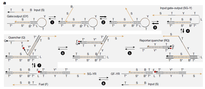 이 기술은, 특정 DNA 가닥을 헤어핀이라고 불리는 접힌 구조로 설계해, 동적 트랩이라는 에너지가 저장된 상태를 만들어 내는 것. 이 헤어핀 구조는 외부에서 '입력'이 되는 다른 DNA 사슬이 가해지면 풀려서 계산이 실행되고, 계산이 끝난 회로를 95℃ 정도까지 가열하면, 모든 DNA의 결합이 풀리면서 단일 가닥 상태로 돌아간다.
